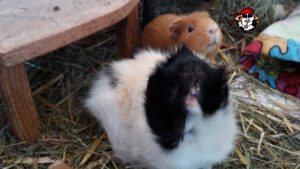 Darin wohnen der junge springfreudige Piratenkapitän Timber (schwarz-weißer Glatthaarkastrat) und die jugendliche Struppi (Glatthaar grauagouti) zusammen.