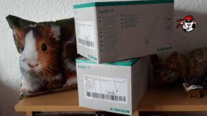 Nach sieben Jahren (2018) sind die kleinen Spritzchen bald aufgebraucht und so gab es jetzt wieder zwei neue Packungen mit je 100 kleinen 1 ml Feindosierungsspritzen ohne Nadel von Braun (53,59 € bei Hygi). Die Einmalspritzen sind aufgeschnitten mit vergrößerter Spritzenöffnung ideal für die viele Medizin mit Päppelfutter – ähnlich den Päppelspritzen, die es zu kaufen gibt.